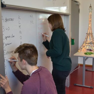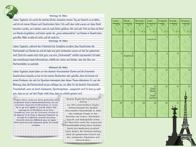 Für eine solche Auszeichnung bedarf es natürlich besonderer Anstrengungen: Die jährlich am Gymnasium Alleestraße stattfindende und von den Lehrerinnen Ramona Hunzelmann und Ina Hoffmann betreute „Drittortbegehung“, die dieses Jahr unter dem Leitmotiv „Deutsche und französische Identität in Europa auf dem Weg in die Zukunft“ stand, bot hierfür den Rahmen. Die Schülerinnen und Schüler erstellten, in Zusammenarbeit mit ihrer französischen Partnerschule, einen zweisprachigen Kalender auf einer Teletandemplattform. Der Austausch und die Zusammenarbeit erfolgte also sowohl persönlich als auch digital. „Zwar hatte sich die Zusammenarbeit vor Ort in den letzten Jahren bewährt“, erklärte Fachlehrerin Ina Hoffmann, „doch durch die Vorarbeit über digitale Medien wurde diese sehr gut erweitert und vorentlastet.“ Über die Plattform konnten sich die Schülerinnen und Schüler beider Länder schon vor der Fahrt kennenlernen, sprachliche Fehler gegenseitig korrigieren und inhaltliche Zielsetzungen abklären.