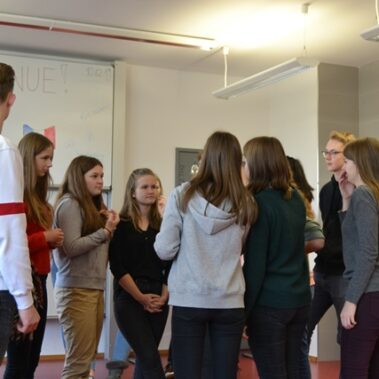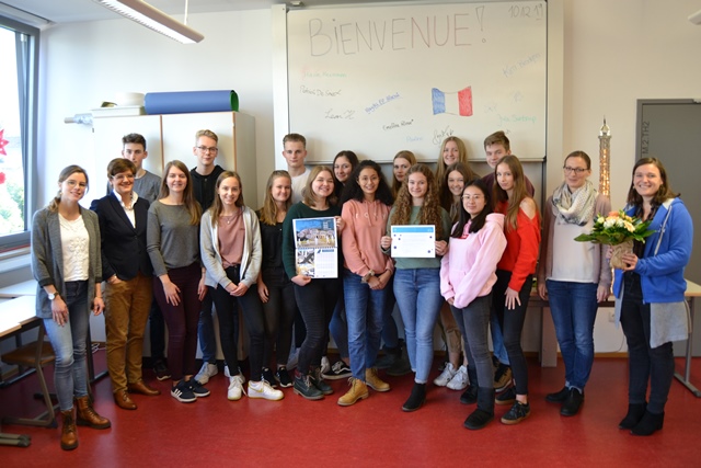 Nach Abschluss des Projekts besuchte jetzt die Juniorbotschafterin des Deutsch-Französischen Jugendwerks (DFJW) die Schülerinnen und Schüler der Projektgruppe. Das DFJW ist eine internationale Organisation im Dienst der deutsch-französischen Zusammenarbeit, die seit 1963 über 9 Millionen jungen Menschen aus Deutschland und Frankreich die Teilnahme an über 360.000 Austauschprogrammen und Begegnungen ermöglicht hat. Madame Quémérais zeigte sich begeistert vom Engagement der Teilnehmerinnen und Teilnehmer und nahm gerne die Einladung zum nächsten „Französischen Abend“ am 24. Januar 2020 am Gymnasium Alleestraße an.
