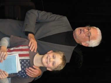 Die Jury verzieht sich wieder, das Publikum tuschelt, tauscht sich aus, äußert vorsichtige Einschätzungen und der Siegburger Bürgermeister Franz Huhn nutzt die Gelegenheit, das Wort zu ergreifen. Er lobt alle fleißigen Leser und betont, dass ja alle hier versammelten Vorleser Sieger sind! Dann kommt der Moment auf den alle warten, die Spannung ist fast unerträglich. Endlich, der Sieger wird durch Herrn Huhn bekannt gegeben und es ist… – … der Kandidat vom Gymnasium Siegburg Alleestraße. Henry jumpt vergnügt nach vorne, seine Freude ist unbändig groß und so lacht er über beide Ohren, als er den Preis entgegennehmen darf.