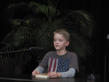 Charly Halft, der Vorsitzende vom Freundeskreis der Stadtbibliothek Siegburg e.V. begrüßt alle herzlich und weist schon vorab auf die Pausenbonbons hin, aber bis dahin müssen alle der Reihe nach ihre Bücher vorstellen und versuchen, die Jury durch den eigenen Vortrag zu überzeugen. Henry Sorg hatte eine Passage aus Michael Endes Roman „Momo“ einstudiert. Blechern und computergleich klingt die Stimme der Puppe, die Momo findet, und auch die Enttäuschung Momos kann Henry vorzüglich umsetzen. Das beeindruckte wohl auch die siebenköpfige Jury, in der auch der Vorjahressieger platzgenommen hatte, denn nach der Bonbonpause verkündet die Jury, dass fünf Kinder, unter ihnen auch Henry, einen unbekannten Text vortragen dürfen. Puh, ist das spannend!