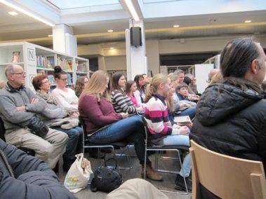 18 Kinder aus den umliegenden Städten rutschen in der Stadtbücherei Siegburg aufgeregt auf ihren Stühlen hin und her, die Eltern scheinen teils nicht weniger nervös.