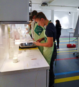 Darüber hinaus wurden die Berufe der Branche vorgestellt: Fachkräfte Lebensmitteltechnik und Lebensmittelchemie. Zu beiden mussten die Schülerinnen und Schüler recherchieren, wie beispielsweise die Anforderungen sind und welche Aufgabengebiete diese Berufe umfassen. So verbindet sich Naturwissenschaft mit Berufsberatung – ein simuliertes Verkaufsgespräch und eine kreative Produktpräsentation inklusive. Schon erstaunlich, wie etwas so Selbstverständliches wie Milch doch mit Spannung erlebt werden kann. „Insgesamt war die Gruppe sehr begeistert!“, schwärmte Schülerin Angelina Kostera.
