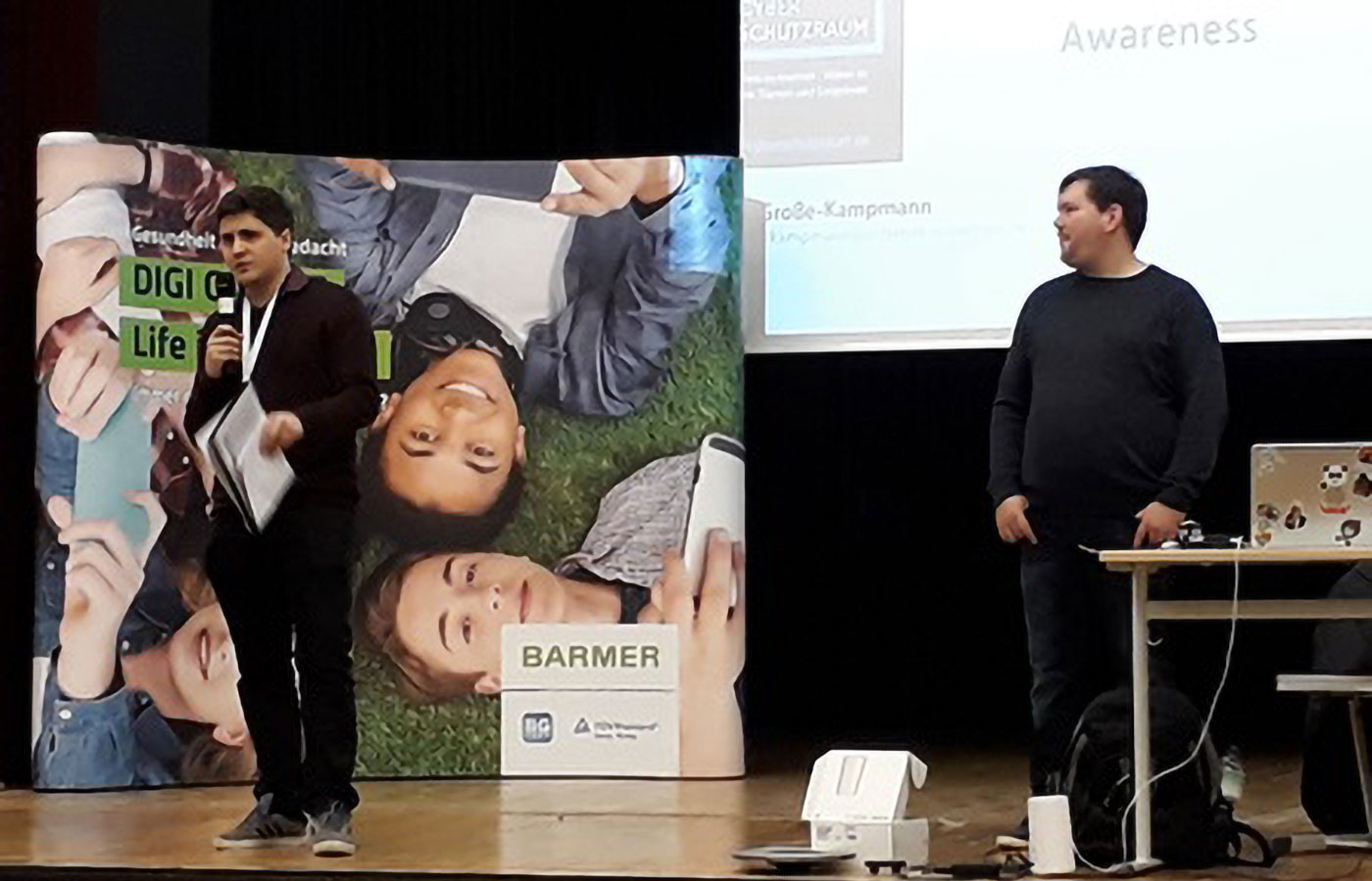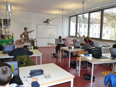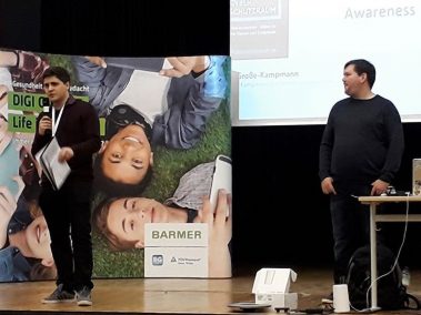 Ermöglicht wurde das Ganze durch die Finanzierung der Barmer Ersatzkasse. Diese interessiert sich von Berufs wegen schon für Digitalisierung, gehen mit ihr doch auch viele Krankheitsbilder einher: Trockene Augen, Nackenschmerzen, „Whatsapp-Daumen“ (Sehnenscheidenentzündungen) oder der früher als Tennisarm bekannte „Mausarm“. Bei so viel Anwendungsmöglichkeiten in den Workshops können die 6. Klässler nur staunen und einige versuchen neugierig durch die Fenster etwas zu erspähen: „Wir wollen auch!“. Doch auch für diese eine gute Nachricht, so Medienbeauftragte Meike Jansen: „Wir wollen dies am Gymnasium Siegburg Alleestraße nun bestenfalls jährlich durchführen. Die Planung für das nächste Jahr läuft bereits.“