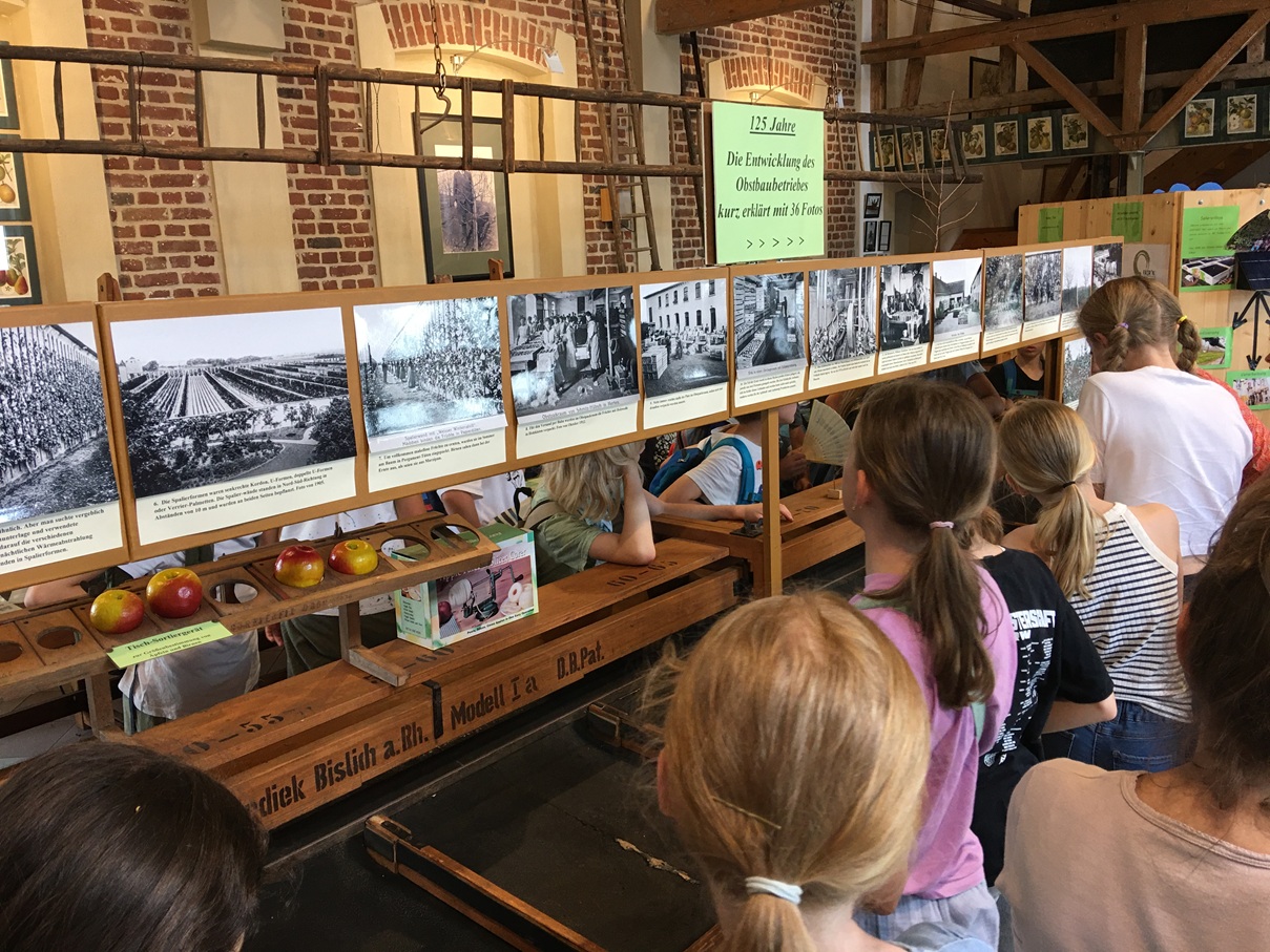 Es wurde viel Spannendes, aber auch Wissenswertes, erzählt, wie z.B. dass 1912 höchstwahrscheinlich Schmitz-Hübsch-Äpfel auf der Titanic lagen, oder wie die Veredelung von verschiedenen Apfelbäumen funktioniert. Die entdeckte Otto Schmitz-Hübsch als Erster in Deutschland. Außerdem wurde über die Geschichte von Schmitz-Hübsch erzählt. Nach der Führung im Apfelmuseum ging es dann raus auf die Plantagen.