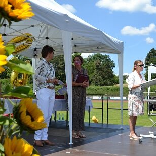 Eine Spezialität am Gymnasium Siegburg Alleestraße ist natürlich auch die Möglichkeit neben dem Abitur gleichzeitig auch noch das Baccalauréat, den französischen Schulabschluss, zu erwerben. Auch in diesem Jahr erreichten dies wieder sechs Schülerinnen und Schüler, die sich der doppelten Aufgabe stellten. Bestes AbiBac-Ergebnis hatte Leo Feldt, der von der Französischlehrerin Elisabeth Udelhofen die Anerkennung überreicht bekam. Gleichsam erreichte Mona Reichmann und Paula Novoty noch das Zertifikat Certilingua. Dies ist ein Exzellenzlabel, dass für mehrsprachige, europäische und internationale Kompetenzen verliehen wird. Insbesondere im sprachlichen Bereich sind dort Leistungen zu zeigen, doch auch interkulturelle Begegnungsprojekte sind ein Teil dessen. So endete ein fantastisches Fest bei bestem Sonnenschein und mit royalem Flair.