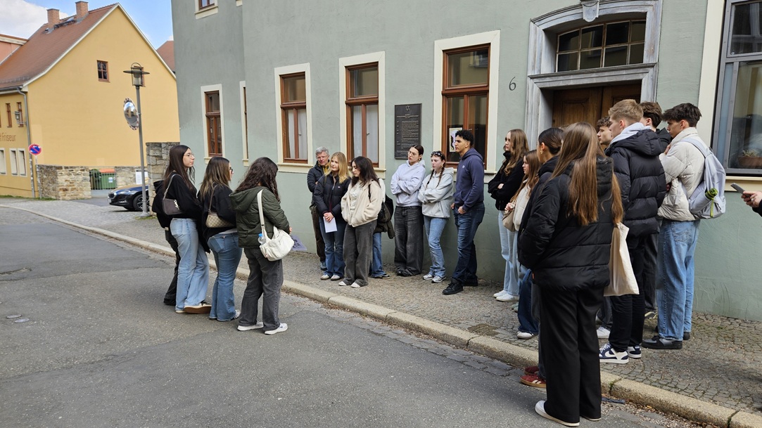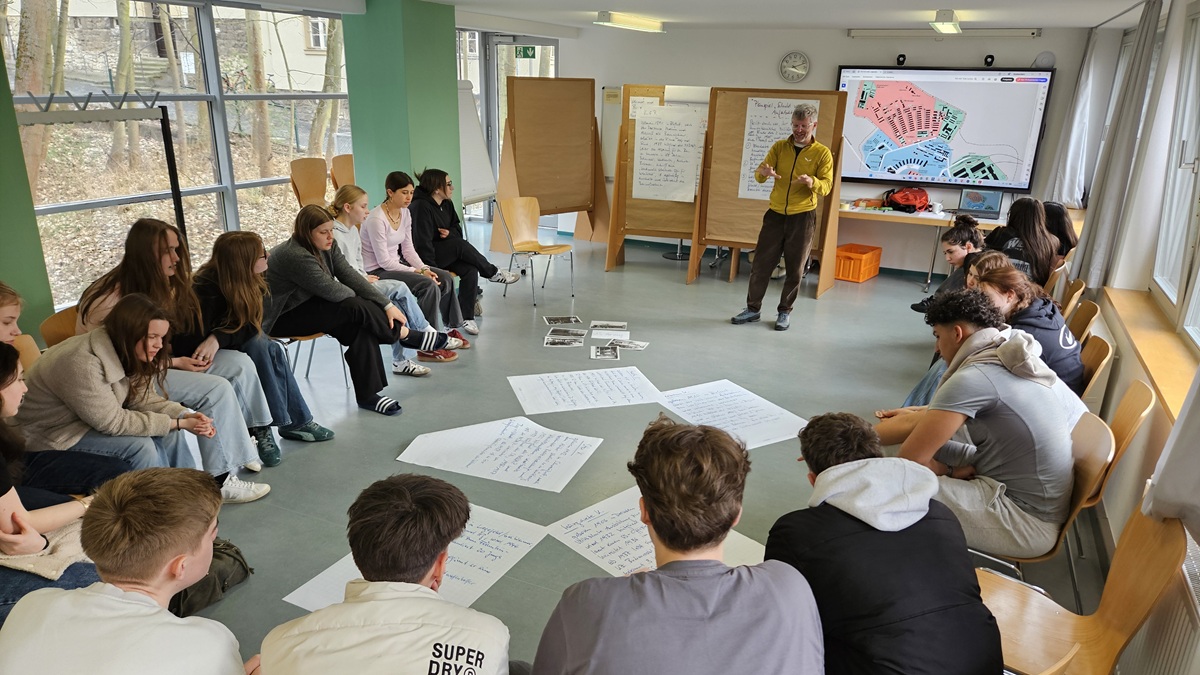 In der durch die Schülerinnen und Schüler moderierten Stadtführung entdeckten die Teilnehmenden so nicht nur die Gebäude, die im Zuge der nationalsozialistischen Umgestaltung entworfen und gebaut worden waren, sondern auch die Häuser, in denen die jüdische Bevölkerung gezwungen war zu wohnen.