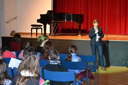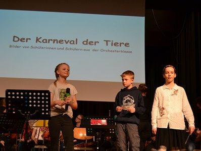 Um den ältesten Grundschulkindern einen Eindruck davon zu verschaffen, was sie im Rahmen des Musikprofils erwartet, gaben Musikklassen und –AG´s in Zusammenarbeit mit der Theater-AG ein vormittägliches Konzert für die Viertklässler. In der Aula des GSA wurde einleitend von der Theater-AG in Zusammenarbeit mit dem Unterstufenchor ein Auszug aus Siegfried – Der Nibelungen erster Teil von Michael Assies inszeniert. Es folgten die Musikklasse 6a mit dem Cup-Song und einige Solisten: Eliana Ubber an der Querflöte wurde bei dem Lied The Guv´nor von Sonja Münning am Klavier begleitet. Malin Höfgen und Nele Thomas gaben an den Querflöten Tanz der Clowns zum Besten, Felicitas Mühlbauer, Nepheli Schlierf und Lia Miller spielten gemeinsam am Klavier Petersburger Schlittenfahrt und Merle Sezer, Annick Pabst und Mascha Pabst ließen aus ihren Querflöten den Lockruf erklingen. Eine Mischung aus vielen verschiedenen Instrumenten hörte man dann wieder in den folgenden Auftritten des Petit Orchestre mit der Zauberflöte und dem Vogelfänger, der Musikklasse 5a mit den Liedern 7 Years und Faded sowie der Darbietung einiger Stücke aus dem Karneval der Tiere von der Orchesterklasse. Abschließend spielte das Schulorchester den begeisterten Viertklässlerinnen und Viertklässlern noch Lieder aus der Peer Gynt-Suite und James Bond vor. Nach dem Konzert beantworteten die jungen Musikerinnen und Musiker noch Fragen ihres Publikums.