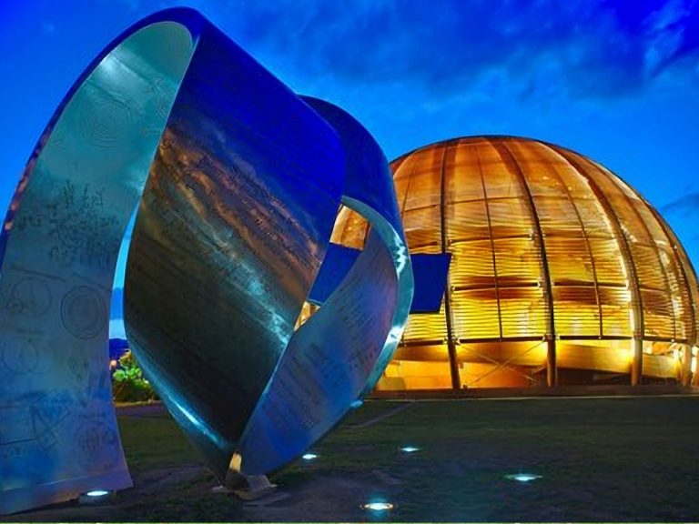 Die Fotos zeigen u.a. eine Nachtaufnahme des Globe, Wahrzeichen des CERN, it der Skulptur “Wandering the Immesurable” und Herrn Kloppenburg mit dem Antimateriebehälter, der Original-Requisite aus dem Film “Illuminati”.