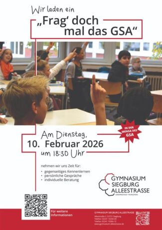 Unter dem Motto „Frag doch mal das GSA“ lud das Gymnasium Siegburg Alleestraße Eltern von Viertklässlerinnen und Viertklässlern zu einer Informationsveranstaltung ein. Zahlreiche interessierte Familien nutzten die Gelegenheit, die Schule kennenzulernen und sich umfassend über das Bildungsangebot und das Schulleben zu informieren.