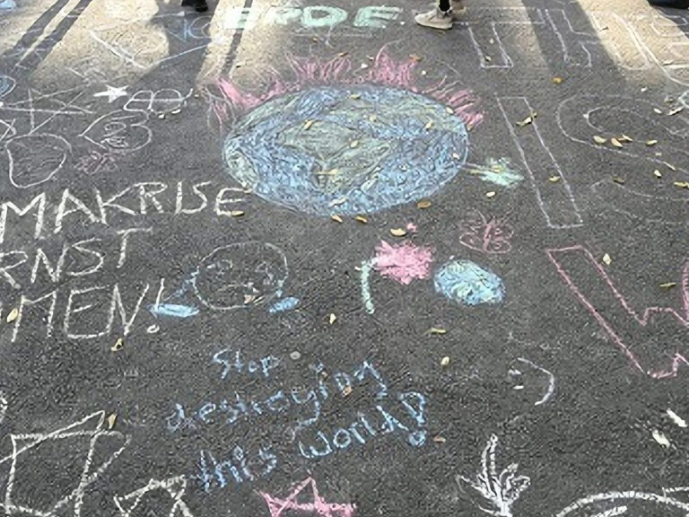 In kürzester Zeit füllte sich ein Bereich des Schulhofes – zwischen Hauptgebäude und Mensagebäude – mit bunten Kreidezeichnungen. Dabei zeigt sich dem Beobachter aber sogleich das gemeinsame Thema: Eine brennende Erde, Warnungen vor der Klimakatastrophe und Fragen an Politik und Gesellschaft, wie man darauf reagieren wolle.