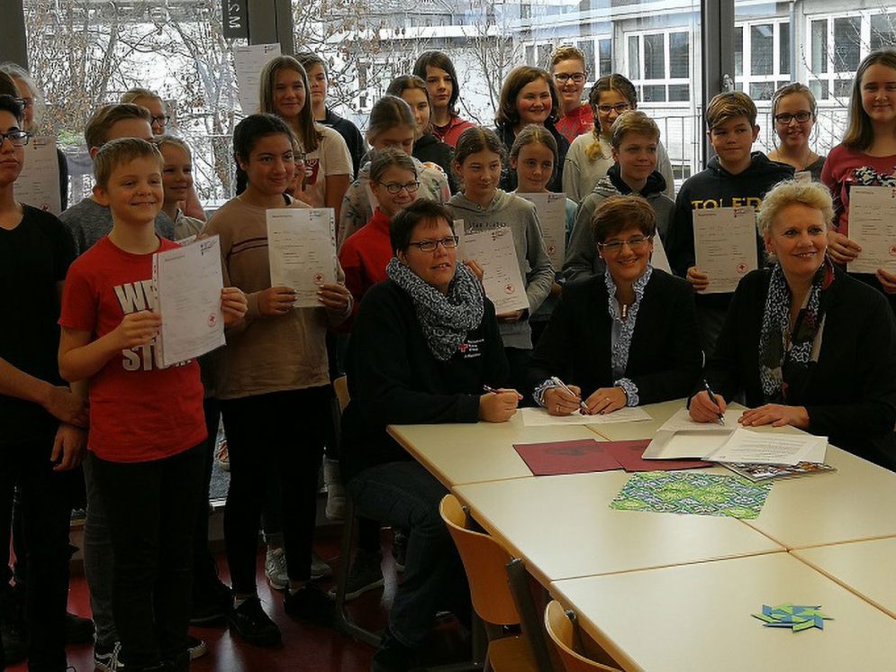 „An Aufgaben wächst man“, prophezeite die stellvertretende Bürgermeisterin Frau Dr. Susanne Haase-Mühlbauer mit Blick auf den ersten Jahrgang der Siebtklässler des Gymnasiums Siegburg Alleestraße, die stolz ihre Urkunden des Deutschen Roten Kreuzes hochhielten. Die Aufgabe ist dabei keine geringere als Leben zu retten. Durch die Unterzeichnung des Kooperationsvertrages mit dem DRK werden nun jedes Jahr in der Woche vor den Herbstferien alle Schülerinnen und Schüler der siebten Klassen von Lehrpersonal des Deutschen Roten Kreuzes zwei Zeitstunden lang in den Themen Grundverständnis des Kreislaufs, Erkennen des Kreislaufstillstands, Aktivieren von Hilfe, strukturierte Alarmierung des Rettungsdienstes und effektive Durchführung der Herzdruckmassage ausgebildet. Dies soll den hohen Zahlen von Herzinfarkten einen kleinen Schritt entgegensetzen. Schulleiterin Sabine Trautwein hob hervor, dass man nun „nicht mehr danebenstehen“ müsse, wenn es zu einem Ernstfall käme. Eine Situation, bei der alle Beteiligten gewinnen: Die Befähigung zur Ersthilfe im Notfall stärkt auch das Selbstbewusstsein der Schülerinnen und Schüler und erzieht gleichzeitig zu Menschlichkeit und kompetenten Handlungsstrategien. Nebenher trainiert man bereits für den Führerschein oder hat einfach Spaß von den Profis zu lernen.