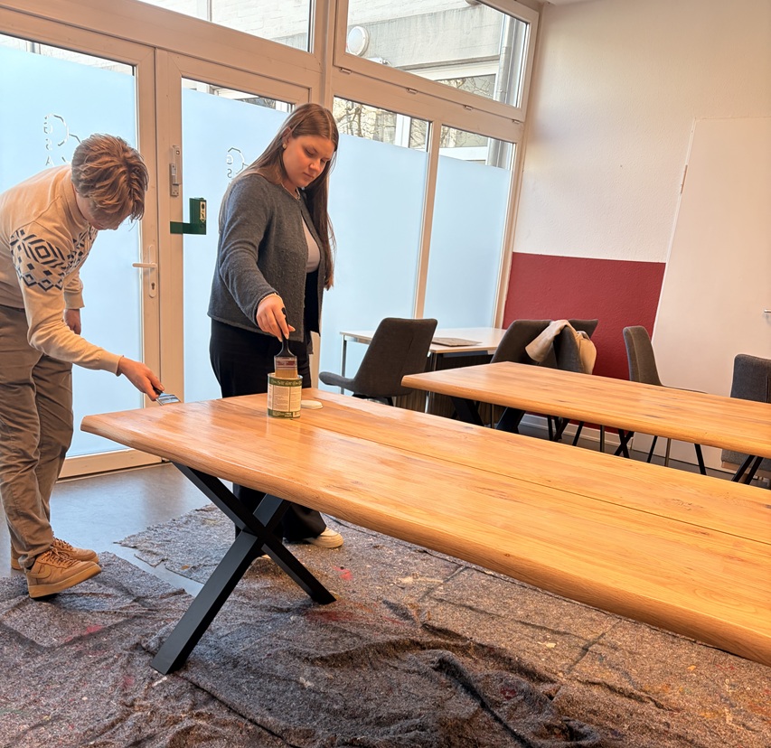 Mindestens genauso beeindruckend ist jedoch das große Engagement der Schülervertretung. Mit viel Einsatz wurde geplant, gerechnet und gemessen, der Raum neu gestrichen und die Möbel eigenständig aufgebaut. Selbst die abschließende Holzlasur wurde in Eigenarbeit aufgetragen – ein Detail, das den Raum nicht nur optisch aufwertet, sondern auch zeigt, wie viel Herzblut in diesem Projekt steckt.