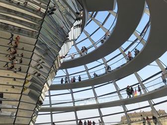 Nach freundlicher Begrüßung fand man sich in einem Presseraum wieder und ergriff die Chance Fragen zu stellen. Terrorbekämpfung, Flüchtlingskrise, internationale Politik – kein brisantes Thema blieb unberührt. Doch nicht nur die globalen Probleme weckten das Interesse der Jugendlichen. Immerhin handelt es sich bei der Sprecherin der Arbeitsgruppe Recht und Verbraucherschutz, die in diesem Jahr 44% der Stimmen ihres Wahlkreises erhielt, um eine Expertin für die Region Rhein-Sieg. „Wie sieht es denn mit dem Ausbau des schnellen Internets in Much aus?“ wollte Justin Tillmann (Q2) wissen und verankerte damit das komplexe Thema Digitalisierung auf der lokalen Ebene speziell seines Heimatorts. Auch der Alltag der Abgeordneten weckte die Neugier der Jugendlichen, die sich die Lebenswelt eines deutschen Politikers konkret vorstellen wollten. Anschließend durften ein gemeinsames Foto und ein Ausflug in die Glaskuppel des Bundestages nicht fehlen. Und spätestens hier oben, hoch über der Inschrift „Dem Deutschen Volke“ und mit weitem Blick über Berlin, war Politik den Schülerinnen und Schülern so nahe wie nie. (hk / November 2017 / Fotos: H. Klein)