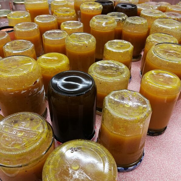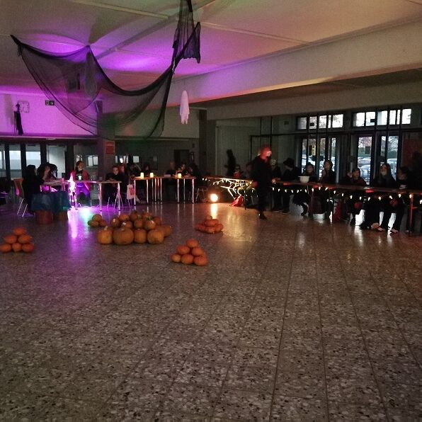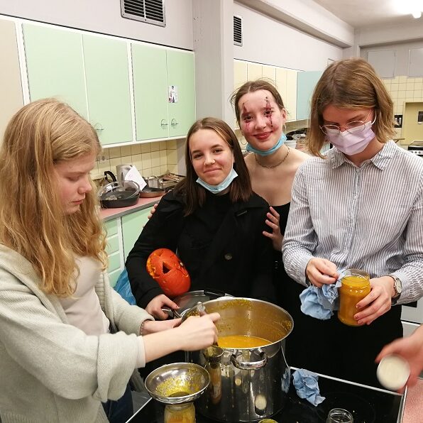 Gemeinsam mit düsterer Musik, gruseliger Beleuchtung und natürlich auch Knabbereien, konnten dann die knapp 60 Anwesenden ihre eigenen Kreationen in Kürbis festhalten. Durch den Abend führte Schülersprecherin Lilly Breunig. Die Kürbisse wurden am nächsten Morgen noch in der Pausenhalle der Schule ausgestellt, bevor sie passend zum Fest mit nach Hause genommen werden konnten – die besten drei erhielten zudem noch einen Preis. Doch was passierte eigentlich mit dem ganzen Kürbisfleisch? „Uns war wichtig, dass wir auch nachhaltig mit den Lebensmitteln umgehen“, erklärt Schülersprecher Joshua Lison. „Daher haben wir aus dem Inhalt Kürbismarmelade eingekocht.“ So gesehen entpuppte es sich am Ende doch als ein vegetarisches Kochvergnügen.