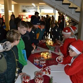 Organisiert durch die Schülervertretung der Schule verwandelte sich die Pausenhalle des Gymnasiums Siegburg Alleestraße am 6.Dezember wieder in einen gemütlichen Weihnachtsmarkt. Schülerinnen und Schüler und natürlich auch Lehrerinnen und Lehrer genossen die vorweihnachtliche Atmosphäre bei Waffeln und Plätzchen. Stimmungsvolles Licht und musikalische Untermalung, rundeten die Veranstaltung ab.