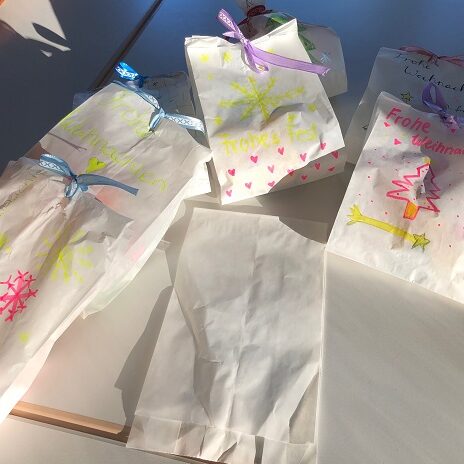 Leider konnten – pandemiebedingt – nur wenige Teilnehmende bei der Übergabe helfen. Umso größer war die Freude der Beschenkten, persönlich gestaltete Präsente entgegenzunehmen, die liebevoll mit aufmunternden Botschaften versehen wurden. Und um auch zukünftig helfen zu können und damit das soziale Engagement fortbesteht, gibt es bereits Pläne, gemeinsam bei der wöchentlichen Verköstigung vor Ort zu helfen – sobald es das Infektionsgeschehen zulässt.