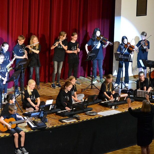 Auf die Ohren gab es am GSA natürlich auch wieder reichlich, wie man das bei einem Gymnasium mit langjährigem Musikprofil erwarten würde. So ließ die Alternate Rock Band „Creepers“ die Boxen mit voller Leidenschaft vibrieren, Mina Locke aus der 6a sang das ambitionierte wie launige Stück „Mama wo bist du?“ aus dem Musical „Elisabeth“ und sorgte für Lacher und sicherlich einige Ohrwürmer