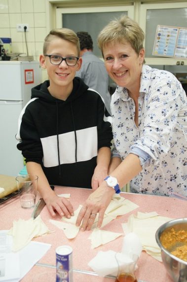 Dieser Ruf hat die Multi-Kulti-Kochgruppe dazu animiert, sich näher mit den türkischen Speisen zu befassen. Unter der Leitung der Köche des Abends, Jonah Reindl (Q2) und Stefan Feit, tauchten 25 Köche in der wunderbaren Poggenpohl-Schulküche des GSA tiefer in die kulinarische Türkei ein. An den ersten beiden Kochblöcken wurden meze hergestellt. Das sind kalte oder warme kleine türkische Speisen, denen man mit der Bezeichnung “Vorspeisen” nicht gerecht wird. Die wörtliche Übersetzung von meze lautet “angenehmer Geschmack”, daher sollen diese Speisen nicht den Magen füllen, sondern den Gaumen erfreuen. Es gab Schafskäsecreme, Bulgursalat, Kichererbsensalat und Börek. Letzteres sind ausgesprochen schmackhafte Blätterteigröllchen, die mit einem Schafskäse-Joghurt-Mix gefüllt waren. Außerdem wurden Weinblätter gerollt und Köfte geformt, eine Art Hackbällchen aus Lammfleisch, Rindfleisch und Bulgur.