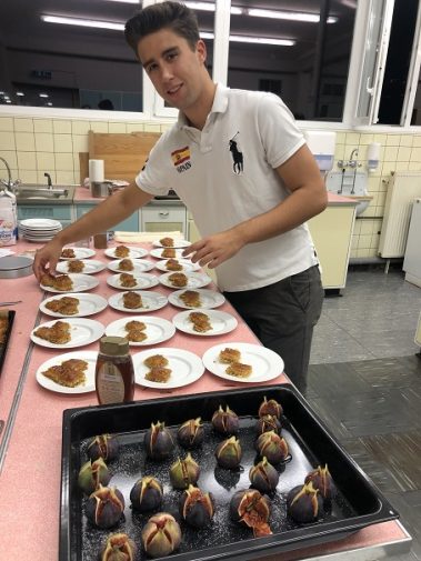 Die dritte Kochgruppe befasste sich mit der Zubereitung der Lammkeule in Joghurtkruste. Das war schon eine Aufgabe, die Lammkeulen für 25 Personen zuzubereiten. Dennoch: Am Ende konnten wir eine wunderbar zarte Lammkeule genießen. Dazu gab es geschmorte mit Tomaten und Paprika gefüllte Auberginen, die auch die Herzen unserer Fleischesser höher schlagen ließen.